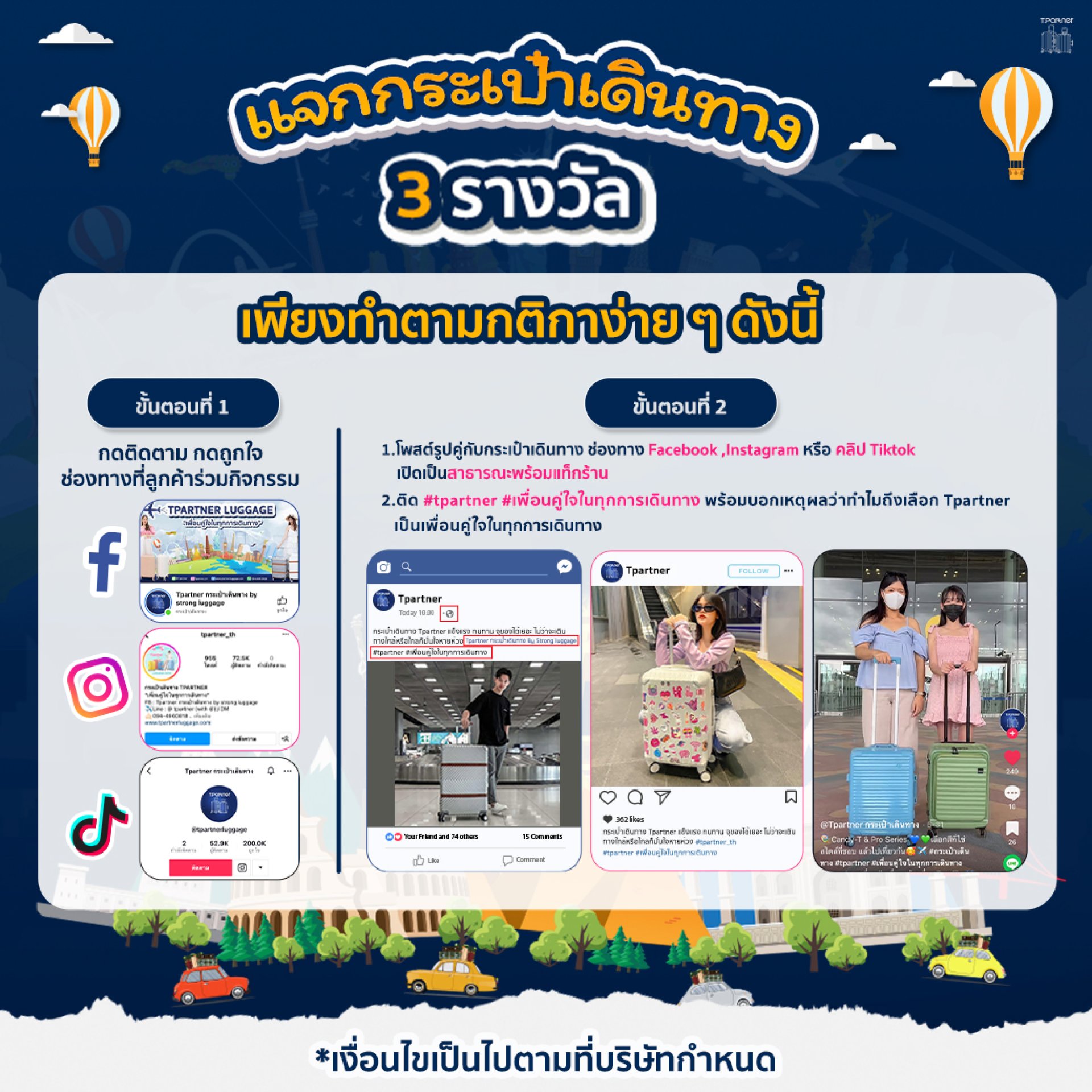 1. โพสต์รูปภาพหรือคลิปวิดีโอที่ถ่ายคู่กับกระเป๋าเดินทางTpartner ออกไปแบบสาธารณะ ในช่องทาง Facebook , Instagram , TikTok ช่องทางใดช่องทางหนึ่ง