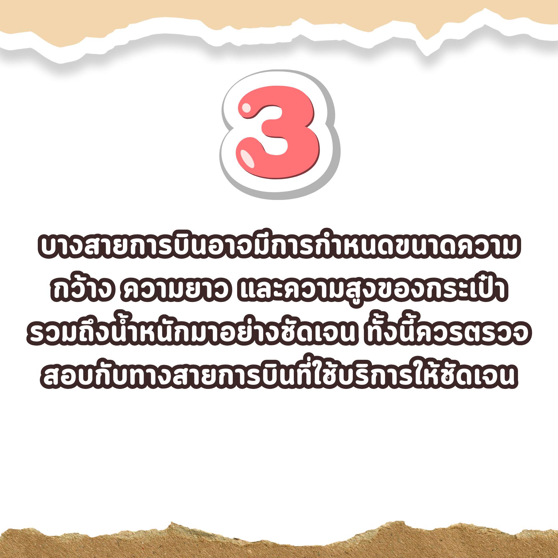 3.บางสายการบินอาจมีการกำหนดขนาดความกว้าง ความยาว และความสูงของกระเป๋า รวมถึงน้ำหนักมาอย่างชัดเจน ทั้งนี้ควรตรวจสอบกับทางสายการบินที่ใช้บริการให้ชัดเจน