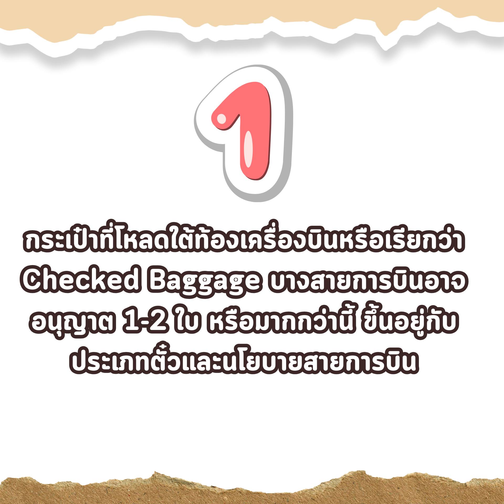 1.กระเป๋าที่โหลดใต้ท้องเครื่องบินหรือเรียกว่า Checked Baggage บางสายการบินอาจอนุญาต 1-2 ใบ หรือมากกว่านี้ ขึ้นอยู่กับประเภทตั๋วและนโยบายสายการบิน