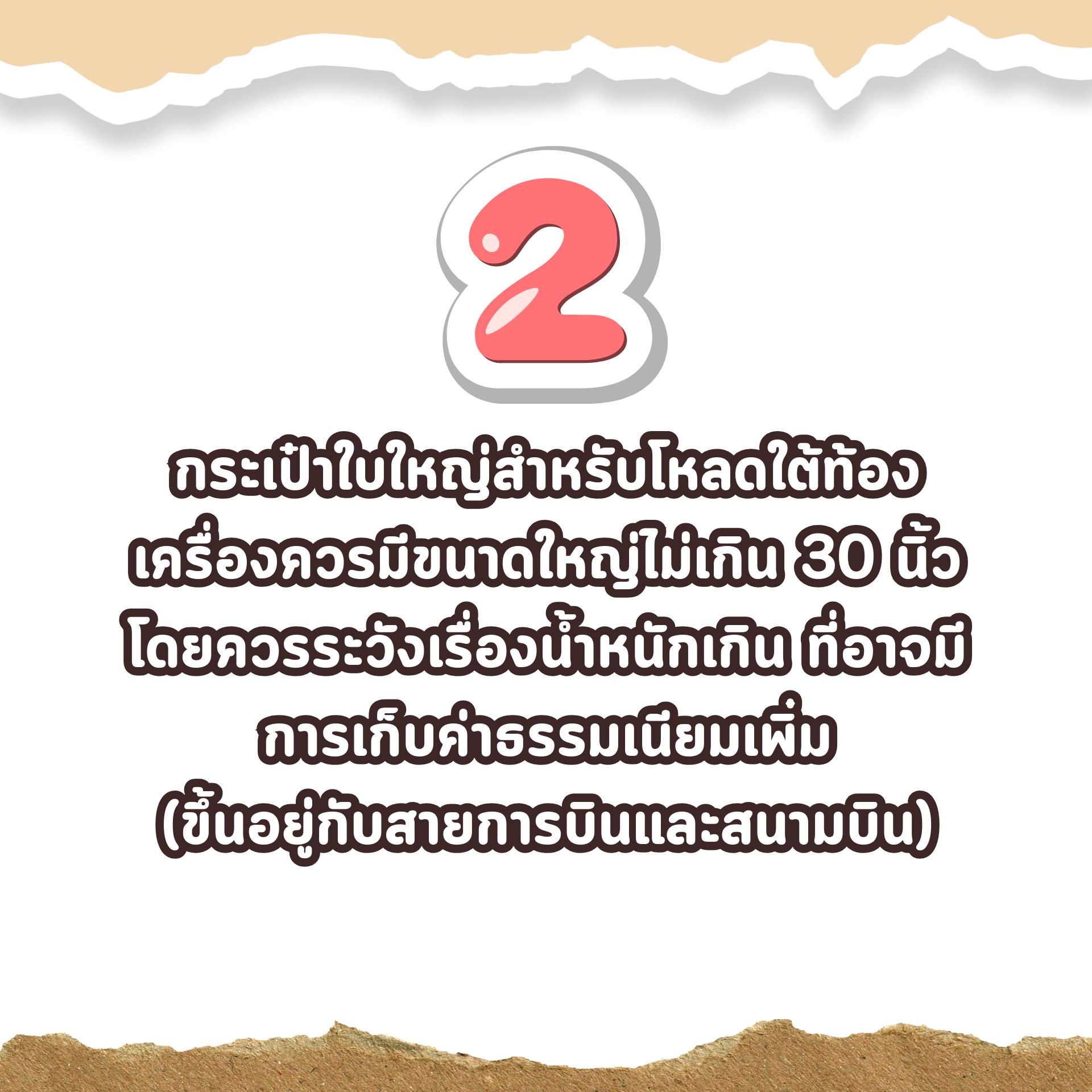 2. กระเป๋าใบใหญ่สำหรับโหลดใต้ท้องเครื่อง ควรมีขนาดใหญ่ไม่เกิน 30 นิ้ว โดยควรระวัง เรื่องน้ำหนักเกิน ที่อาจมีการเก็บค่าธรรมเนียมเพิ่ม (ขึ้นอยู่กับสายการบินและสนามบิน)