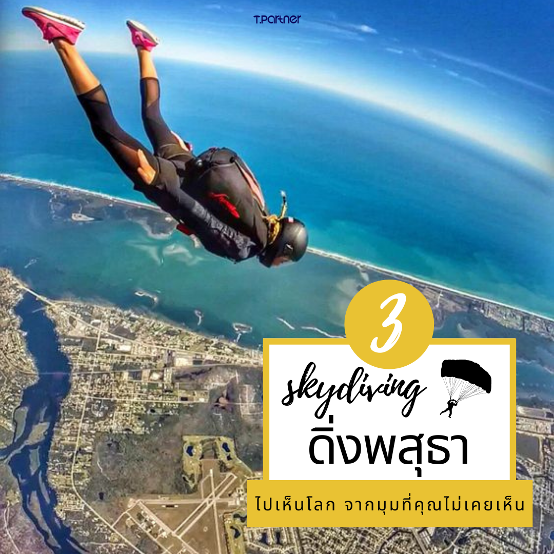 Skydiving ดิ่งพสุธา ขอแนะนำสำหรับคนที่มีสุขภาพแข็งแรงและไม่มีโรคประจำตัวด้วยนะคะ เพราะนอกจากต้องใช้ความกล้าที่จะเล่นแล้วร่างกายคุณจะต้องพร้อม ก่อนการเล่นจริงคุณต้องได้รับการฝึกฝนดูแลจากผู้เชี่ยวชาญเท่านั้น Skydivingจะเปิดประสบการณ์ใหม่ให้คุณได้เห็นโลก จากมุมที่คุณไม่เคยเห็น คุณจะจดจำอย่างไม่มีวันลืมแน่นอนค่า