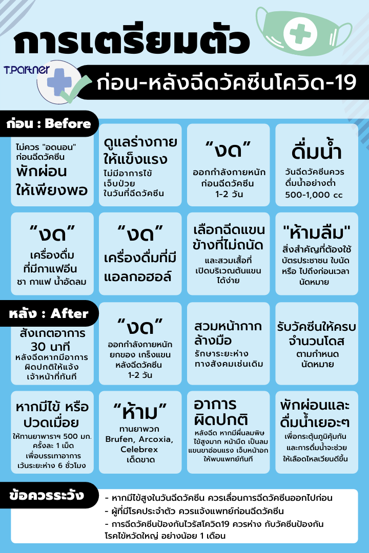 - ดูแลตนเองให้แข็งแรง ไม่มีอาการไข้ หรืออาการเจ็บป่วย ในวันที่ฉีดวัคซีน