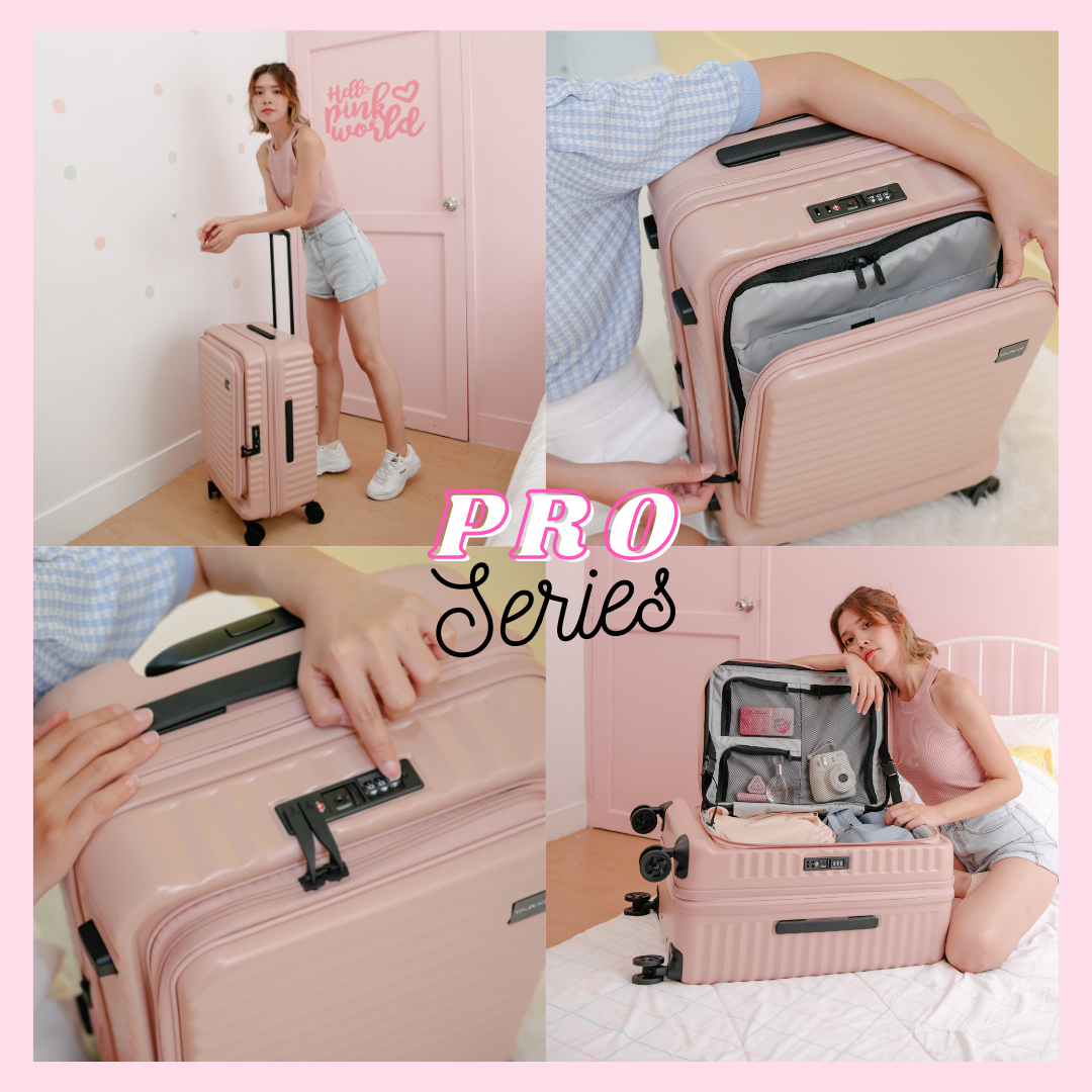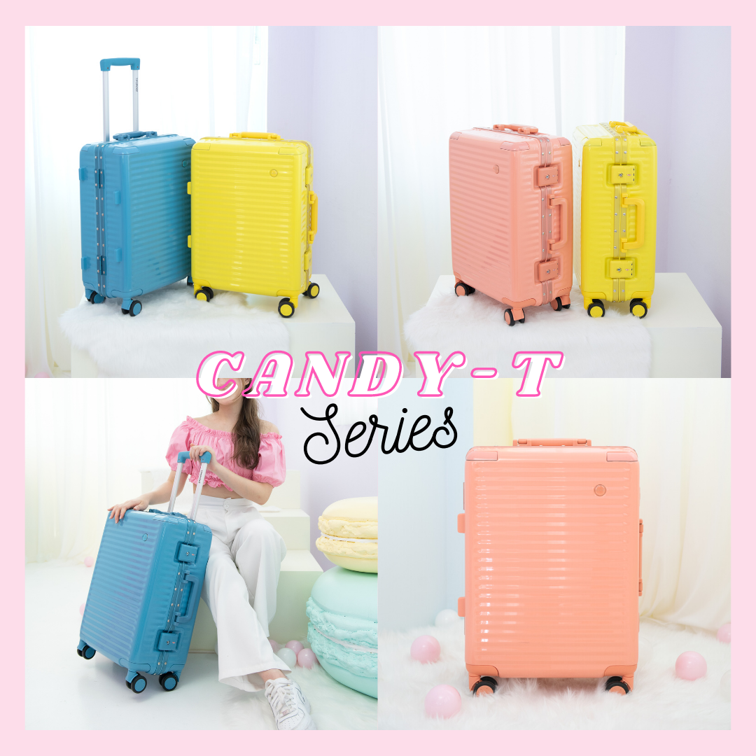 Candy-T Series ใหม่ล่าสุด กระเป๋าเดินทางเฟรมอลูมิเนียม รุ่นแรก! ที่มีสีสันสดใส เหมือนลูกกวาด ฟ้า เหลือง ชมพู 3 สีน่ารักซุกซน ไม่น่าเบื่อ รุ่นนี้ สีชมพูยังออกแบบมาไม่เหมือนใคร เป็นสีชมพูพีช ละมุนน่ามอง น่ารักจนต้องเก็บไว้ในครอบครอง