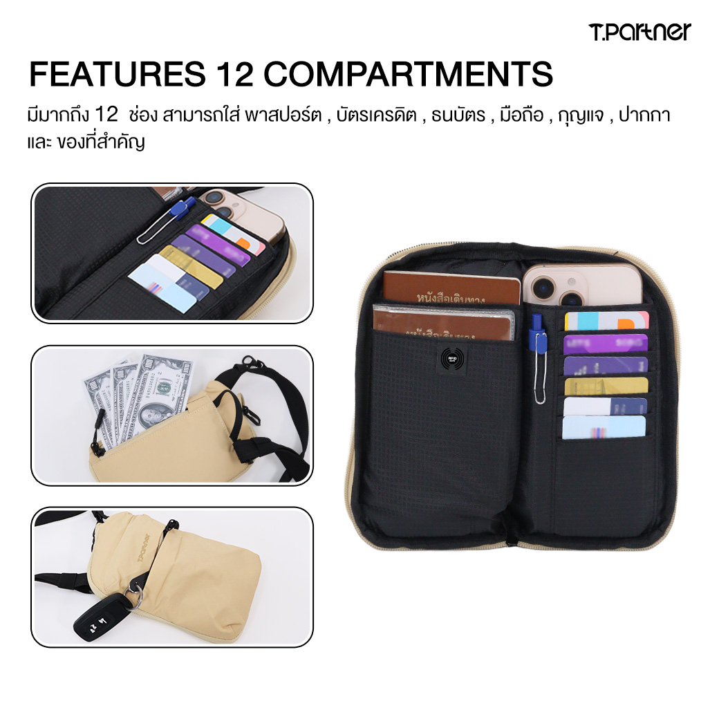 ► มีช่องมากถึง 12 ช่อง สามารถใส่ พาสปอร์ต , บัตรเครดิต , มือถือ , Boarding Pass และของที่สำคัญ