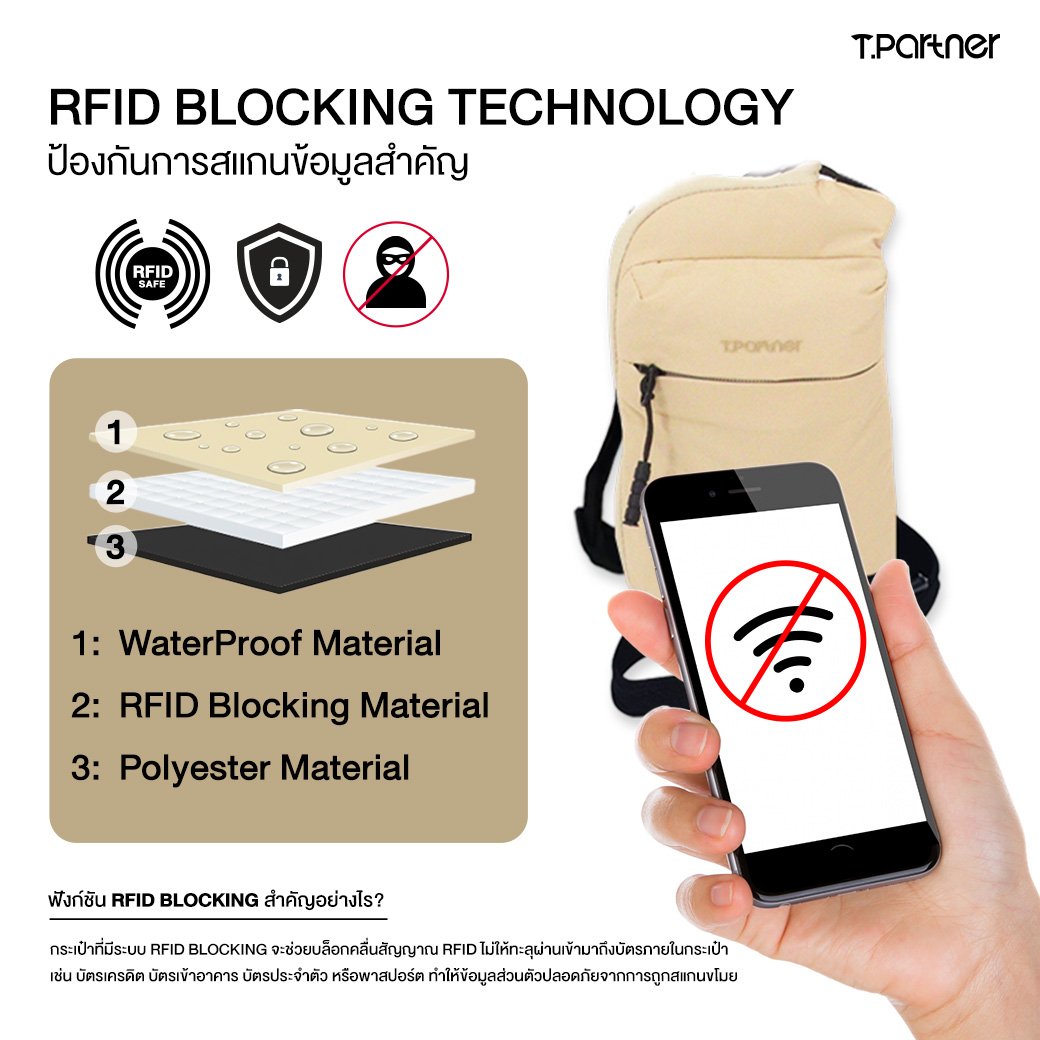 ►ช่อง RFID Block (Radio Frequency Identification) กระเป๋าที่ออกแบบมาเพื่อ ป้องกันการสแกนข้อมูลสำคัญ เช่น บัตรเครดิต โดยไม่ได้รับอนุญาต เพื่อความปลอดภัยในการเดินทาง