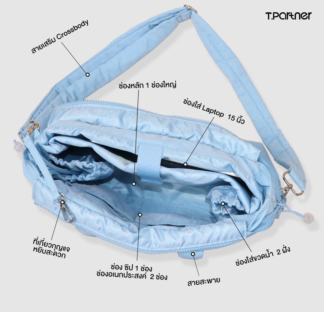 กระเป๋ารุ่น “Cloudy” คือ กระเป๋าสะพายข้างที่ออกแบบมาเพื่อการใช้งาน พร้อมลุยในวันที่คุณเร่งรีบ ตัวกระเป๋ามีน้ำหนักเบา ทนทาน สามารถใส่ของได้เยอะ เหมาะสำหรับ สายออฟฟิศ ที่เน้นการใช้งาน ใส่โน๊ตบุ๊ค,ใส่แล็ปท็อป,เอกสาร มาพร้อม โทนสี Pastel ฟ้า ชมพู ครีม เทา สีน่ารักสดใส สไตล์ ทีพาร์ทเนอร์ ใช้ได้ทุกการเดินทาง สามารถคล้องกับกระเป๋าล้อลาก และ ถือขึ้นเครื่อง carry on ได้อีกด้วย
