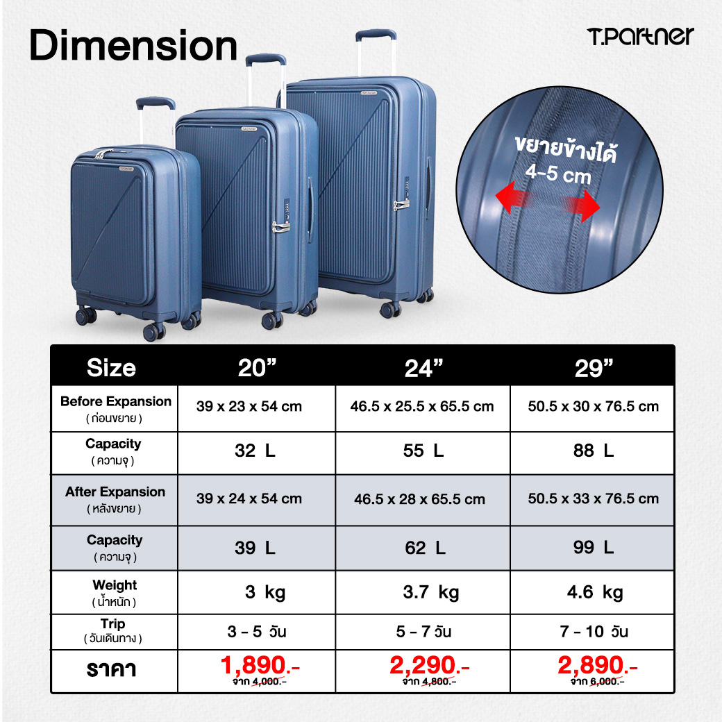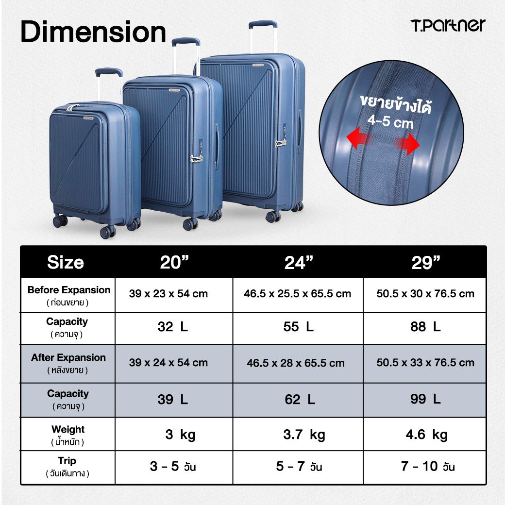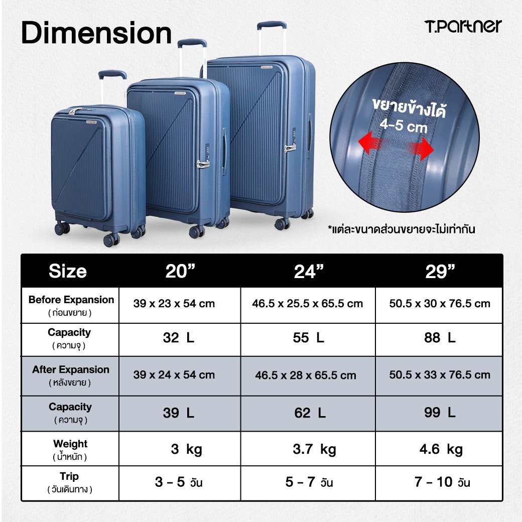 24”=46.5x25.5x65.5 cm(น้ำหนัก 3.7 kg. ความจุ 55 ลิตร)