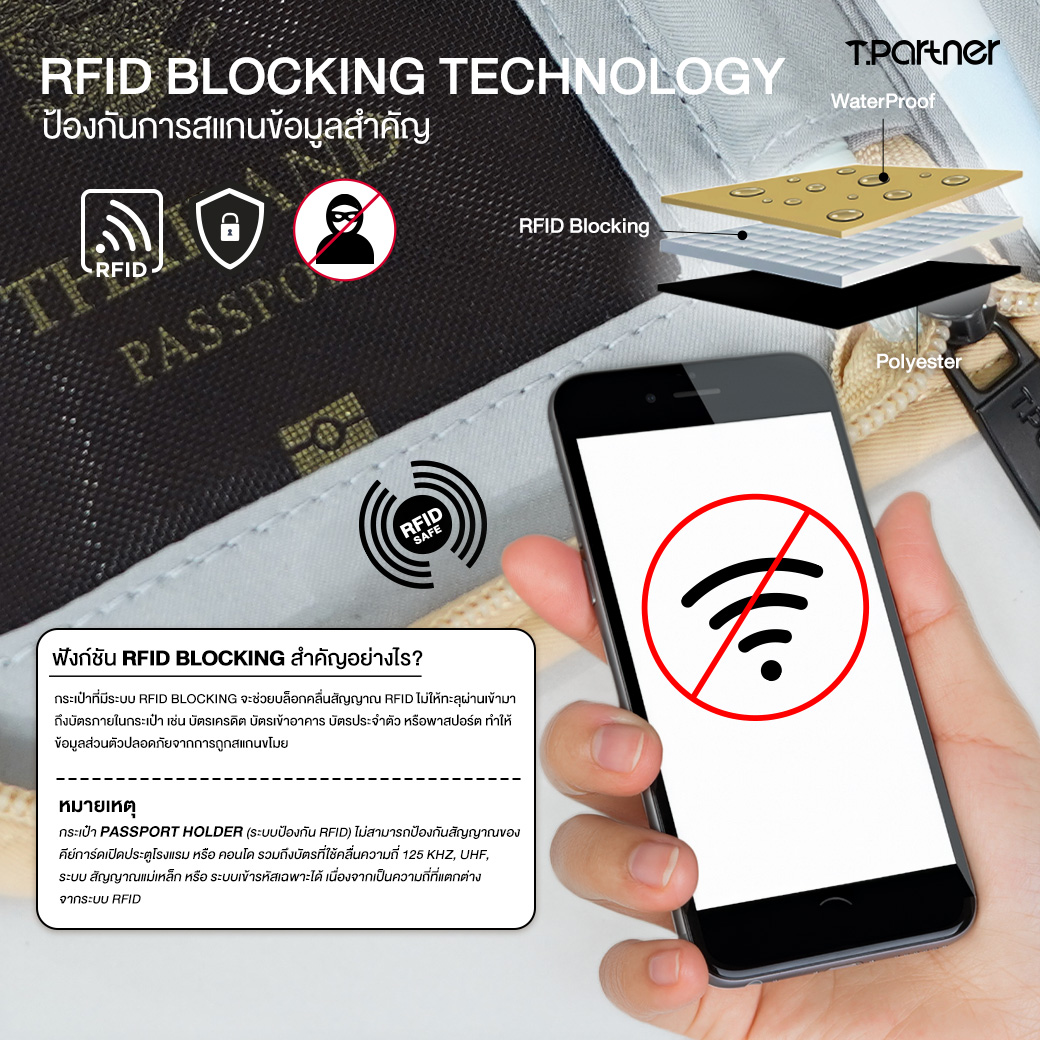 ► เทคโนโลยี RFID Blocking (Radio Frequency Identification) กระเป๋าที่ออกแบบมาเพื่อ ป้องกันการสแกนข้อมูลสำคัญ เช่น บัตรเครดิต โดยไม่ได้รับอนุญาต เพื่อความปลอดภัยในการเดินทาง