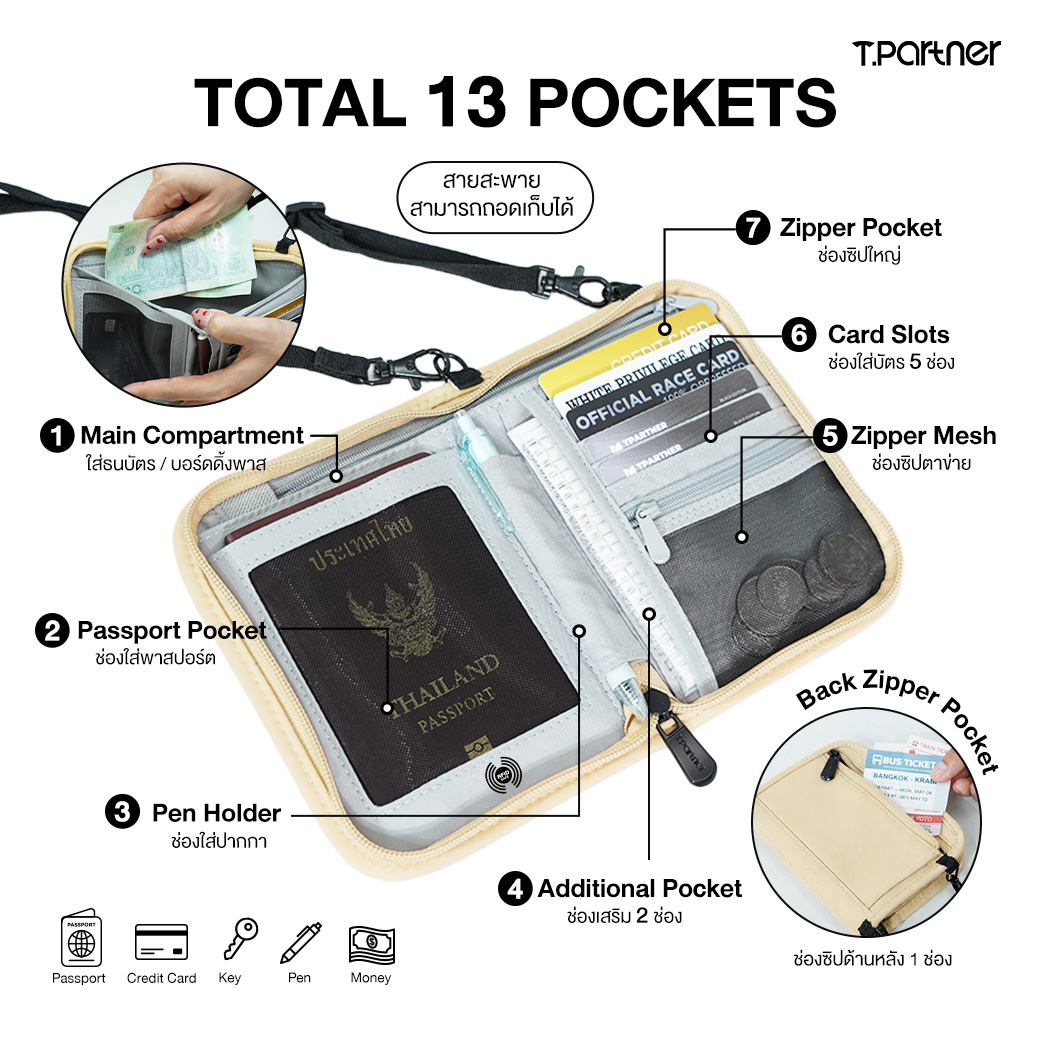 ► มีช่องมากถึง 13 ช่อง จัดเก็บ แบ่งสัดส่วนชัดเจน สามารถใส่ Passport , บัตรเครดิต , เงิน, Broading pass ของที่สำคัญ และมีช่องใส่เหรียญ แยกเป็นสัดส่วน